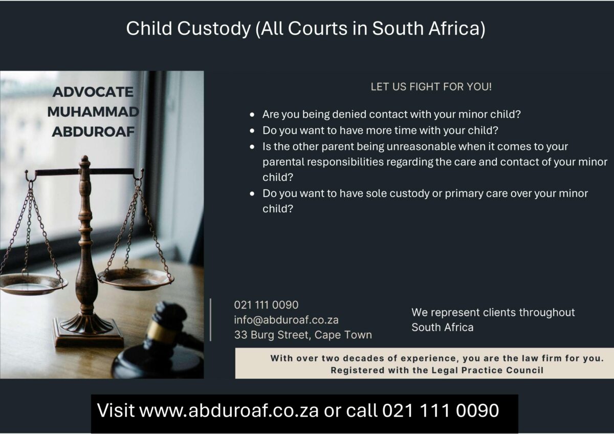 If you require legal assistance or representation with your child custody dispute, then feel free to contact us for assistance. The Firm Advocate, Muhammad Abduroaf, deals with these types of matters.